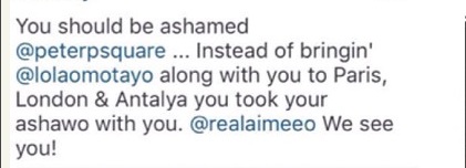 that Peter Okoye of P-Square was cheating on his wife, Lola