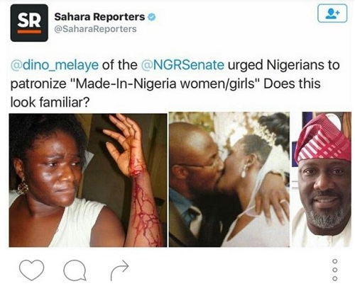 “Dino Melaye of the Nigerian Senate urged Nigerians to patronize ‘Made-In-Nigeria women/girls’,” Sahara Reporters tweeted at the senator, adding, “does this look familiar?”